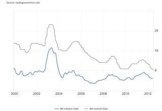 Накартинке вывидите инфляцию иставку ЦБнаблюдавшиеся вБразилии с1999 по2011год.