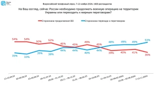 Доля россиян, выступающих за немедленное начало переговоров с Украиной, впервые с начала войны превысила половину населения, показал ноябрьский опрос Russia Field.По данным социологов, за переход к переговорному процессу высказались 53% респондентов, а доля тех, кто хотел бы продолжения боевых действий, опустилась до 36%. «Доля сторонников продолжения военной операции достигла наименьшего, а доля сторонников переговоров — наибольшего уровня за весь период наблюдений», — пишет Russia Field.