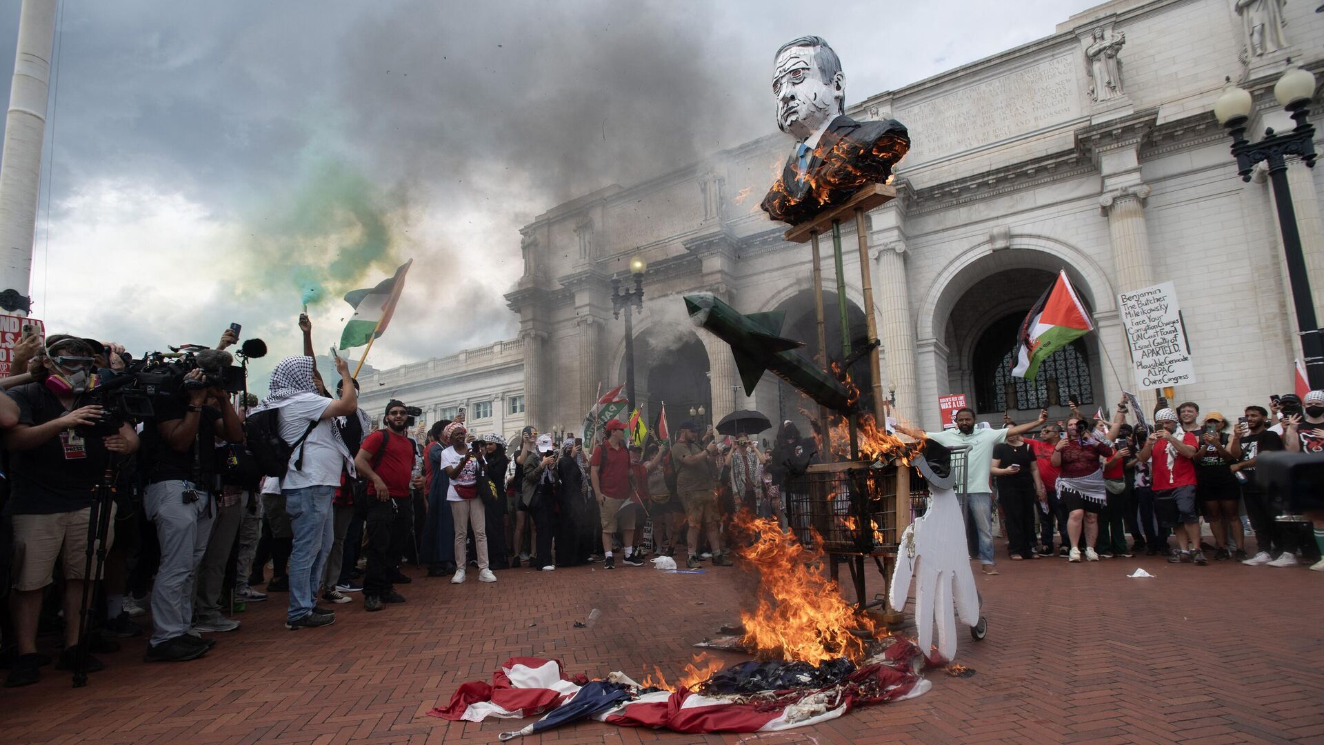 Протестующие против выступления премьер-министра Израиля Биньямина Нетаньяху в Конгрессе США сорвали и сожгли американские флаги у вокзала в Вашингтоне,... РИА Новости, 25.07.2024