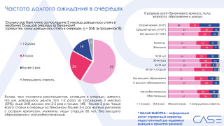 10% респондентов стояли вочереди более 20 минут изних 1,8%— более 45 минут. Среди тех,кому пришлось стоять вочереди более 5 раз за3 месяца,это делали 14% (т. е. 2,5% отвсей выборки).