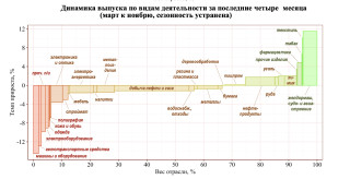 Лишь внемногих гражданских отраслях,благодаря инерции,набранной импортозамещением,еще фиксируется рост (вычисленный сосвобождением отсезонности),например,впроизводстве лекарственных средств или текстиля. Нобольшинство невоенных секторов охвачены спадом— отпроизводства строительных материалов идопищевой промышленности,которая пошла наснижение после многих лет роста.